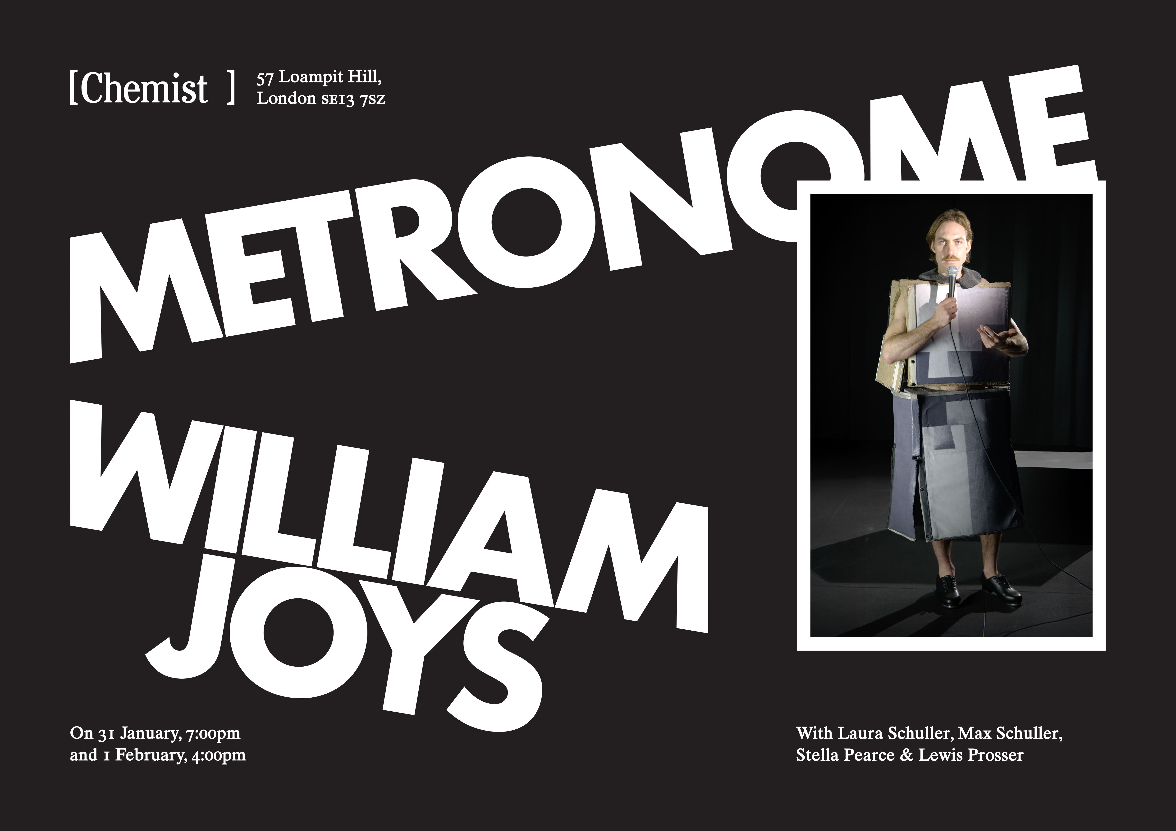 Featuring performers Lewis Prosser, Laura Schuller, and Stella Pearce, with music by Max Schuller. Running time approximately 45 minutes, please arrive promptly.